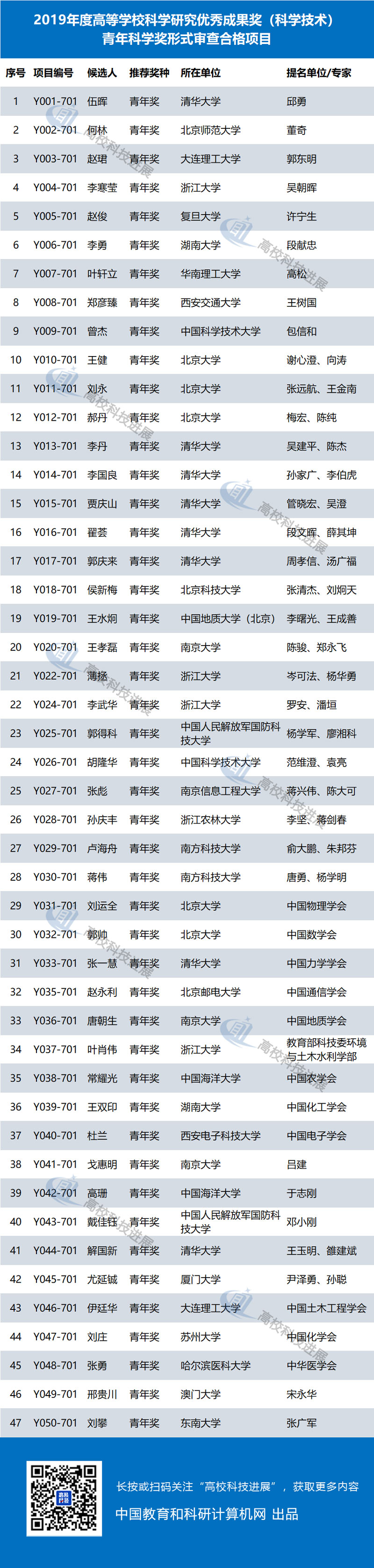 7月22日,2019年度高等学校科学研究优秀成果奖(科学技术)推荐/提名工作已结束。教育部科技司组织对候选项目/候选人进行了形式审查,确定形式审查合格941项/人(含专用项目32项),不合格92项,形式审查过程中,推荐/提名单位或专家提出撤销推荐/提名13项。形式审查合格项目中,自然科学奖347项,技术发明奖125项(通用项目109项,专用项目16项),科学技术进步奖422项(通用项目406项,专用项目16项),青年科学奖候选人47人。