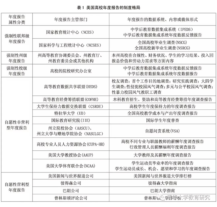 第一,组织规范。按照《2002年教育科学改革法》的规定,美国在2002年建立了国家教育科学研究院,下辖4个研究中心,国家教育统计中心就是其中之一,负责收集、分析、报告和发布美国和他国的教育统计数据。在高校内部,1955年以前美国仅10所左右的高校有院校研究办公室,到1964年这一数字上升至115所,现在几乎所有的高校都有院校研究办公室,负责对内和对外的报告,院校研究办公室主任一般兼任校级年度报告的负责人。