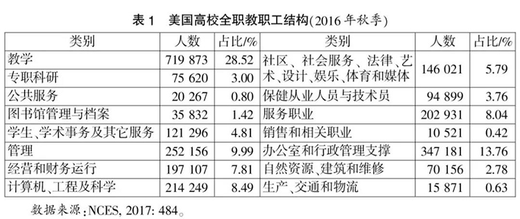 NCES关于2016年的数据,对教职工做了进一步的细分。(见表1)在近400万教职工中,全职人员252.40万人,教学人员占到28.52%,加上专职科研人员,二者合计比1999年高出0.72个百分点,非专业人员也提高了1.17个百分点,但总体看,结构并没有明显变化。同时,教学人员中的全职人员仅占50.3%,是各类人员中比例最低的,而有4类人员中全职人员的占比超过90%,依次为管理人员(97.3%),自然资源、建筑和维修人员(94.4%),经营和财务运行人员(93.6%),计算机、工程及科学人员(91.7%),具体原因还需进一步研究。