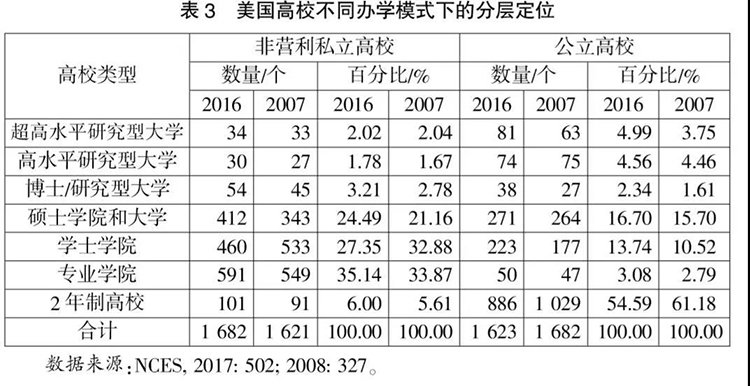 从《教育统计摘要2008》开始,NCES采用新的标准,根据高校研发经费支出、研发人员数量、授予博士学位的规模对高校进行分类,但研究型大学中公立高校与私立高校的分布态势并未显著改变。同时,无论是公立高校还是非营利私立高校,年授予20个以上博士学位的高校数量与占比(表3中前3类大学)都有所提高。