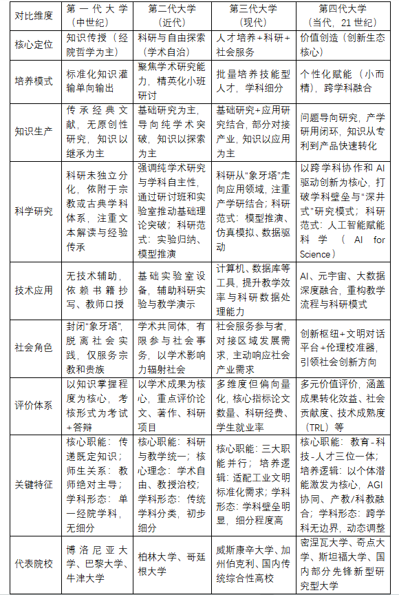 展言之,第一代大学源于中世纪,以博洛尼亚大学、巴黎大学为代表,其核心使命是知识传授,主要为教会与世俗政权培养神学、法学、医学等专业人才。教育模式以讲授与辩论为主,具有鲜明的宗教性与精英性,大学如同脱离社会的“象牙塔”。第二代大学以柏林大学为标志,其革命性贡献在于将科学研究确立为核心职能,形成了“教学与科研相统一”的现代大学形态。同时,倡导“大学自治、教授治校、学术自由”理念,构建了以学科为基础的院系结构,并通过基础研究推动知识创新,为工业革命提供了至关重要的科学支撑与人才保障。第三代大学以院系、专业、课程、学分、学位为基本架构,形成了“人才培养、科学研究、社会服务”三位一体的职能体系。最难能可贵的是提出了“威斯康星思想”,即在人才培养和科学研究之外,明确将社会服务作为大学的第三大使命。大学主动突破“象牙塔”局限,通过技术转化、人才输送和咨询服务等方式,直接推动区域经济社会发展,成为驱动工业化与现代化的核心力量。