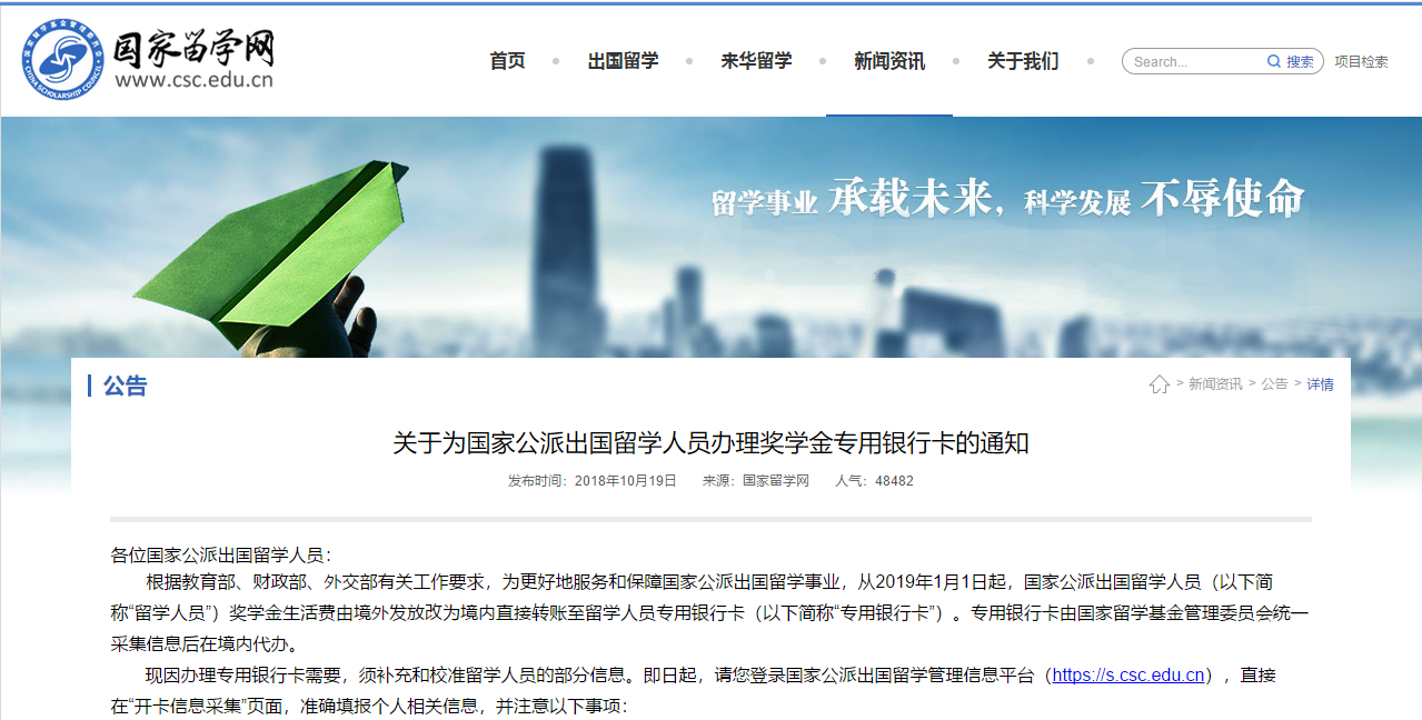 紧急通知!自2019年1月1日起,CSC公派资助将由境外发放改为境内转账至公派人员专用银行卡,请相关人员务必在2018年10月28日24时前在系统内完成信息填报,并办理公派专用银行卡。