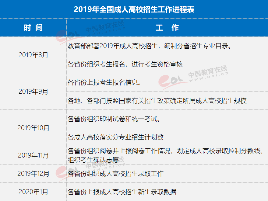 三、严格招生来源计划编制和管理。各地各部门和高校要结合经济社会发展,加强对本地区、本行业成人高等教育需求的分析预测,综合考虑学校办学条件、报名人数及2019年高职院校扩招百万等因素,优化招生专业结构,严格按照脱产、业余、函授等不同学习形式科学编制招生来源计划。各地各部门和各高校要按照2019年全国成人高校招生工作进程表(附件2)和有关计划编制时间安排,按时完成计划编制各阶段工作。