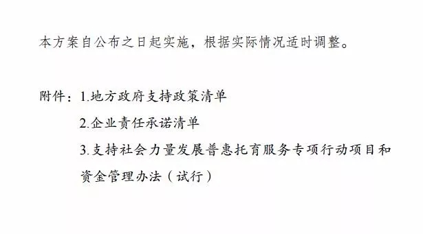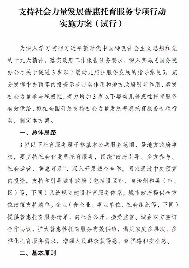 为深入学习贯彻习近平新时代中国特色社会主义思想和党的十九大精神,落实政府工作报告任务要求,深入实施《国务院办公厅关于促进3岁以下婴幼儿照护服务发展的指导意见》,激发社会力量参与积极性,着力增加3岁以下婴幼儿普惠性托育服务有效供给,国家发展改革委、国家卫生健康委共同起草形成了《支持社会力量发展普惠托育服务专项行动实施方案(试行)》(以下简称《实施方案》)。