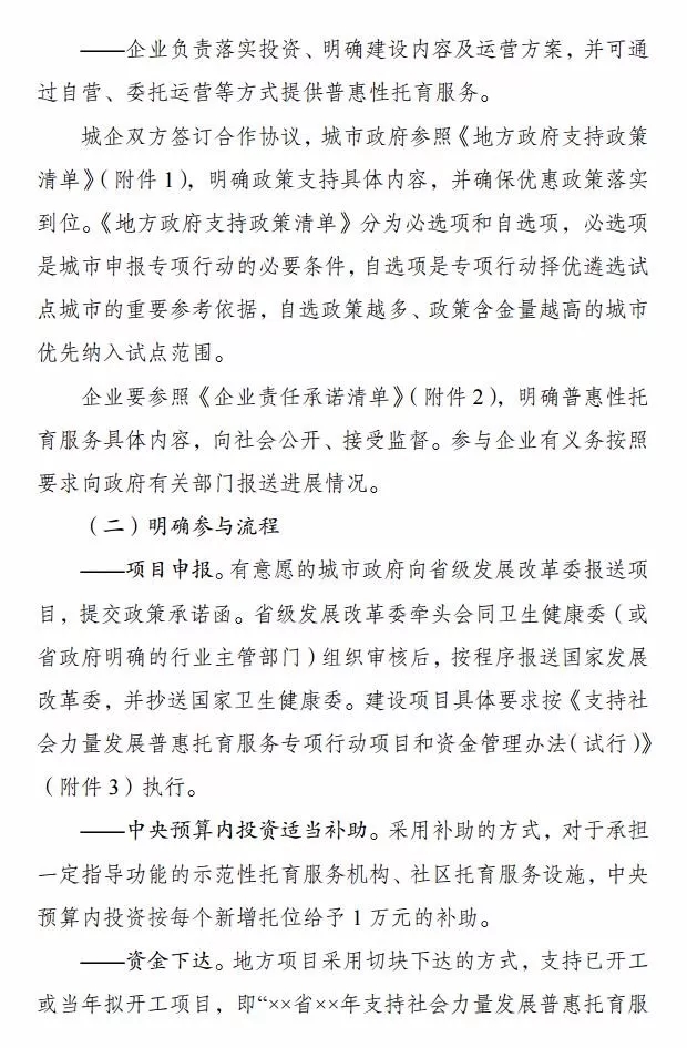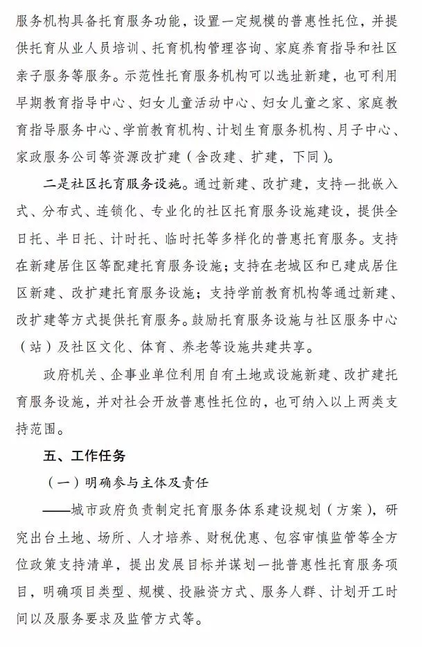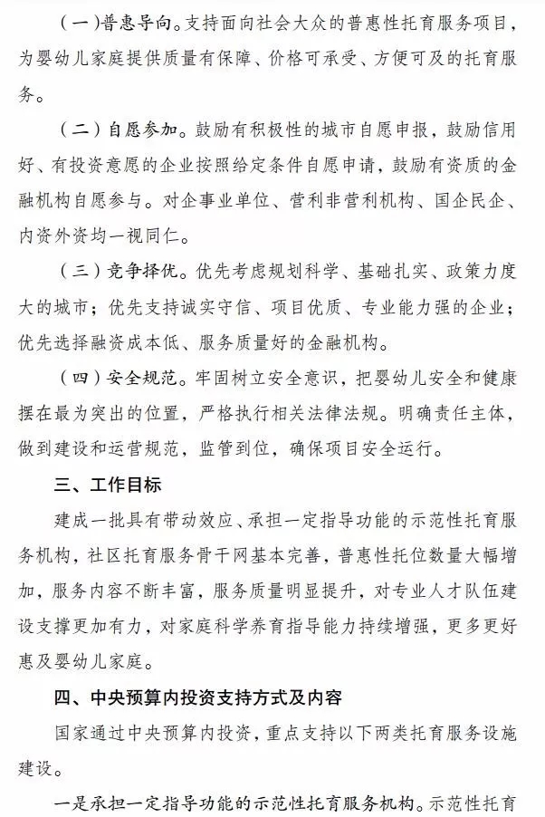 根据实施方案,国家通过中央预算内投资,重点支持两类托育服务设施建设。一是承担一定指导功能的示范性托育服务机构;二是社区托育服务设施,通过新建、改扩建,支持一批嵌入式、分布式、连锁化、专业化的社区托育服务设施建设,提供全日托、半日托、计时托、临时托等多样化的普惠托育服务。