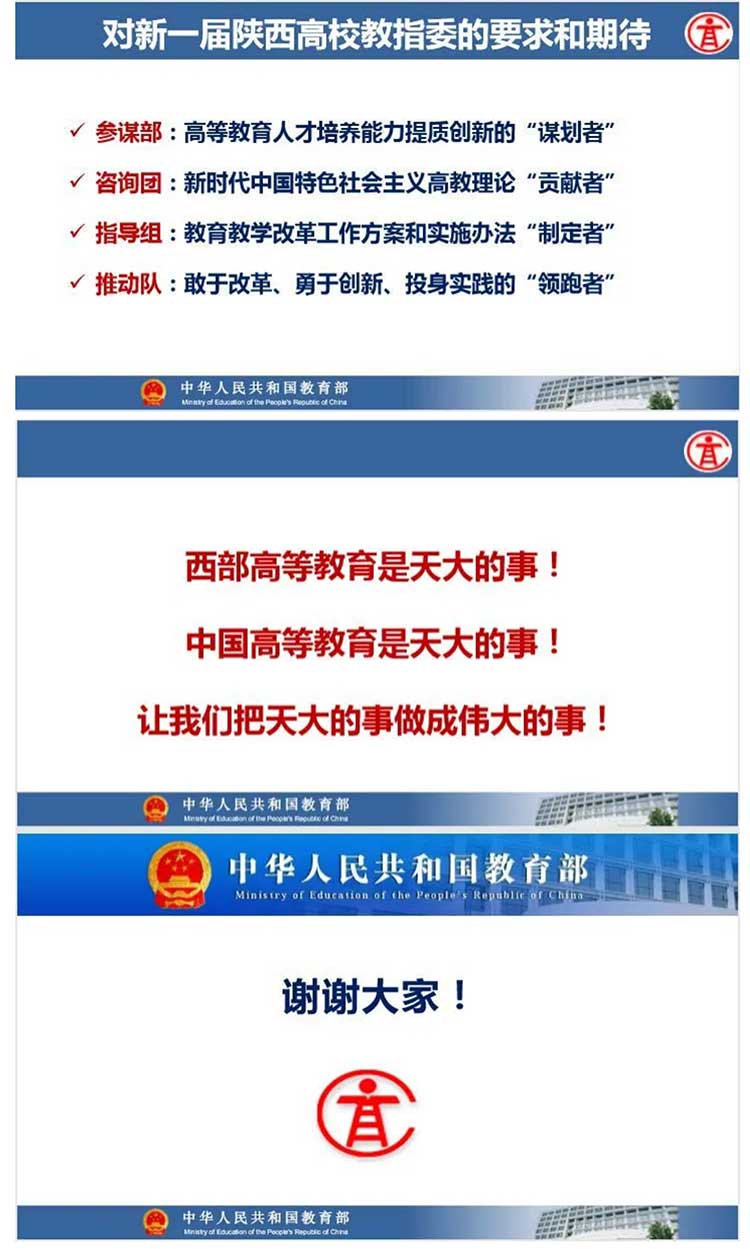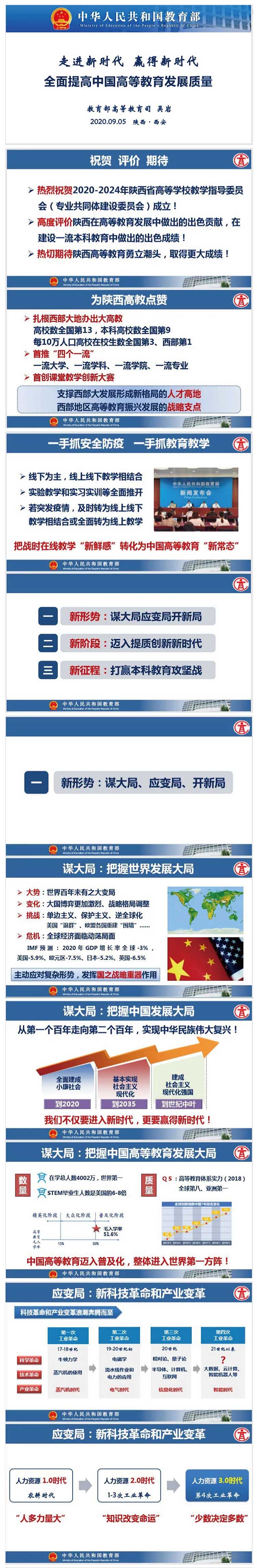 9月5日,2020-2024年陕西省高等学校教学指导委员会成立大会召开,教育部高等教育司司长吴岩应邀参会并作了“走进新时代,赢得新时代,全面提高中国高等教育发展质量”专题报告。