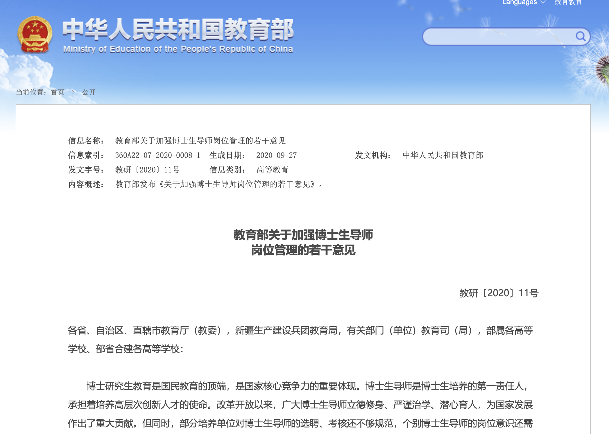 日前,教育部印发了《关于加强博士生导师岗位管理的若干意见》(以下简称《意见》),切实加强博士生导师岗位管理。