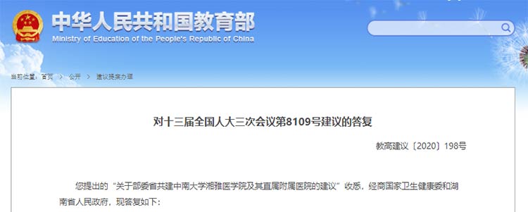 您提出的“关于部委省共建中南大学湘雅医学院及其直属附属医院的建议”收悉,经商国家卫生健康委和湖南省人民政府,现答复如下: