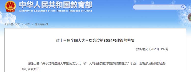 您提出的“关于对将温州大学建设成为以‘侨’为特色的省部共建高校的建议”收悉,现就涉及教育部业务部分答复如下: