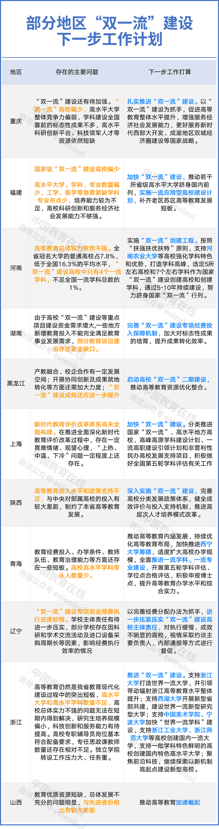 多地针对高等教育发展现状、“双一流”建设等提出存在的主要问题及下一步工作打算。其中,重庆、福建、河南等地明确提出省内“双一流”高校偏少、高水平大学竞争力偏弱、一流学科偏少等问题。一起来看: