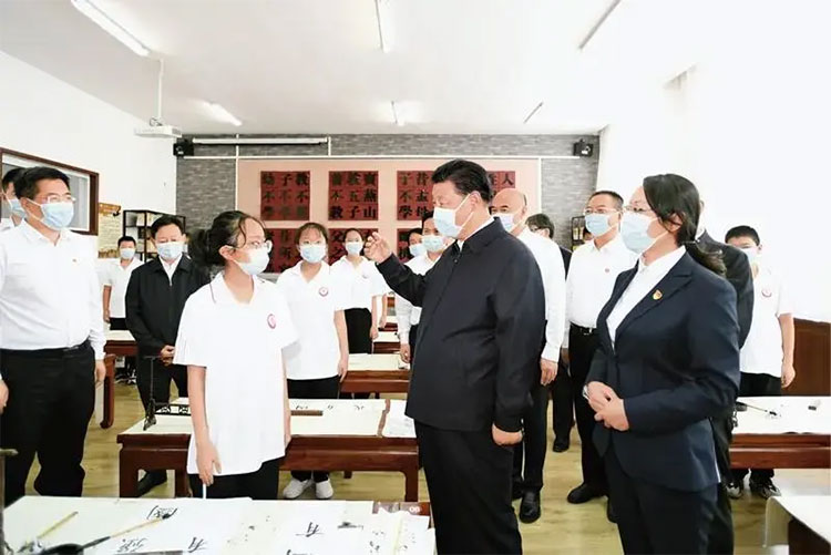 2021年9月13日至14日,中共中央总书记、国家主席、中央军委主席习近平在陕西省榆林市考察。这是14日上午,习近平在绥德实验中学考察时,同正在练习书法的学生亲切交流。 新华社记者 李学仁/摄