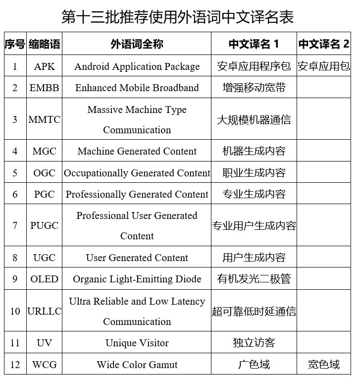 近日,外语中文译写规范部际联席会议专家委员会审议通过第十三批12组推荐使用外语词中文译名。