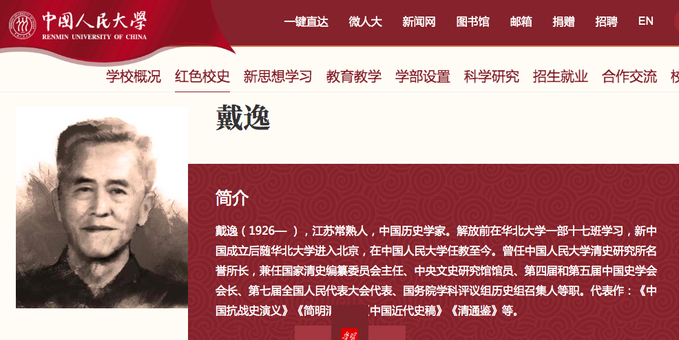 戴逸,1926出生,江苏常熟人,中国历史学家。解放前在华北大学一部十七班学习,新中国成立后随华北大学进入北京,在中国人民大学任教至今。曾任中国人民大学清史研究所名誉所长,兼任国家清史编纂委员会主任、中央文史研究馆馆员、第四届和第五届中国史学会会长、第七届全国人民代表大会代表、国务院学科评议组历史组召集人等职。代表作:《中国抗战史演义》《简明清史》《中国近代史稿》《清通鉴》等。