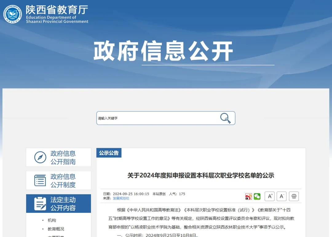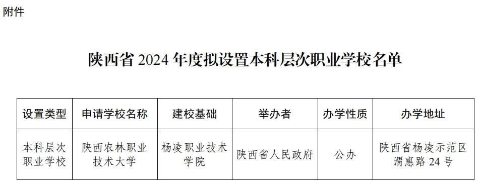 9月25日,陕西省教育厅发布《关于2024年度拟申报设置本科层次职业学校名单的公示》,根据有关规定,经陕西省高校设置评议委员会考察和评议,对拟向教育部申报的“以杨凌职业技术学院为基础,整合相关资源设立陕西农林职业技术大学”事项予以公示。