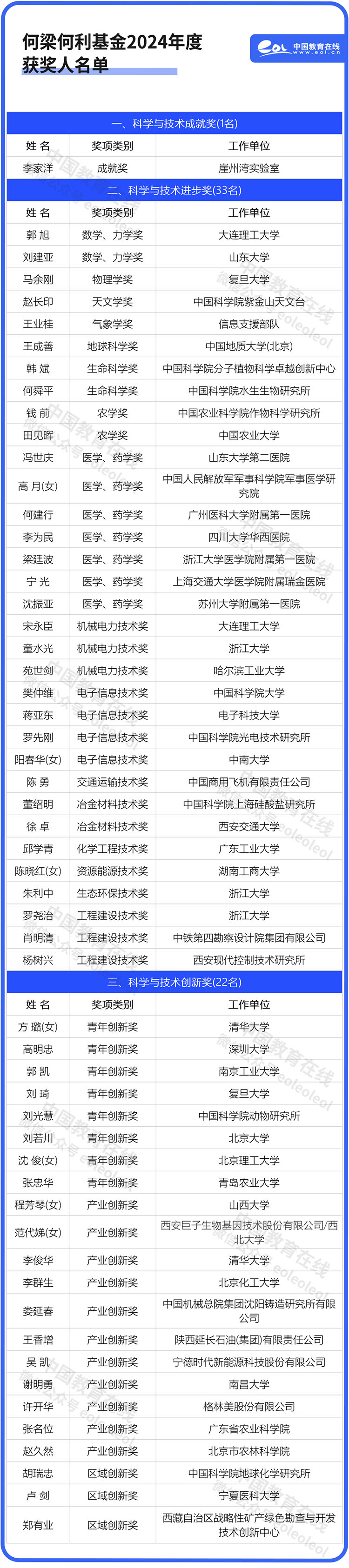 据介绍,何梁何利基金是香港爱国金融实业家何善衡、梁銶琚、何添、利国伟先生于1994年3月30日捐资创立的、以奖励中华人民共和国杰出科技工作者为宗旨的科技奖励基金。2024年度有1名为我国科技进步与创新作出卓越贡献的杰出科技工作者,荣获“何梁何利基金科学与技术成就奖”,授予证书、奖金100万港元;33名在科学技术领域取得重大发明、发现和科技成果的优秀科技工作者,荣获“何梁何利基金科学与技术进步奖”,各授予证书、奖金20万港元;22名具有高水平科技成就,通过技术创新和管理创新,创造重大经济效益和社会效益的优秀科技工作者,荣获“何梁何利基金科学与技术创新奖”,各授予证书、奖金20万港元。