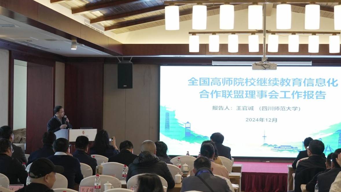 联盟轮值理事长单位、四川师范大学继续教育学院院长王官诚代表联盟理事会作工作报告。报告回顾了2024年联盟开展的主要工作,包括持续更新升级支持服务平台、完善课程共建共享机制、成立联盟专家委员会等,并对2025年联盟的主要工作计划进行了介绍,包括增加11-15所省属师范大学作为联盟副理事长单位(常务理事单位),开展2025年度继续教育工作先进集体和先进个人评选等工作。