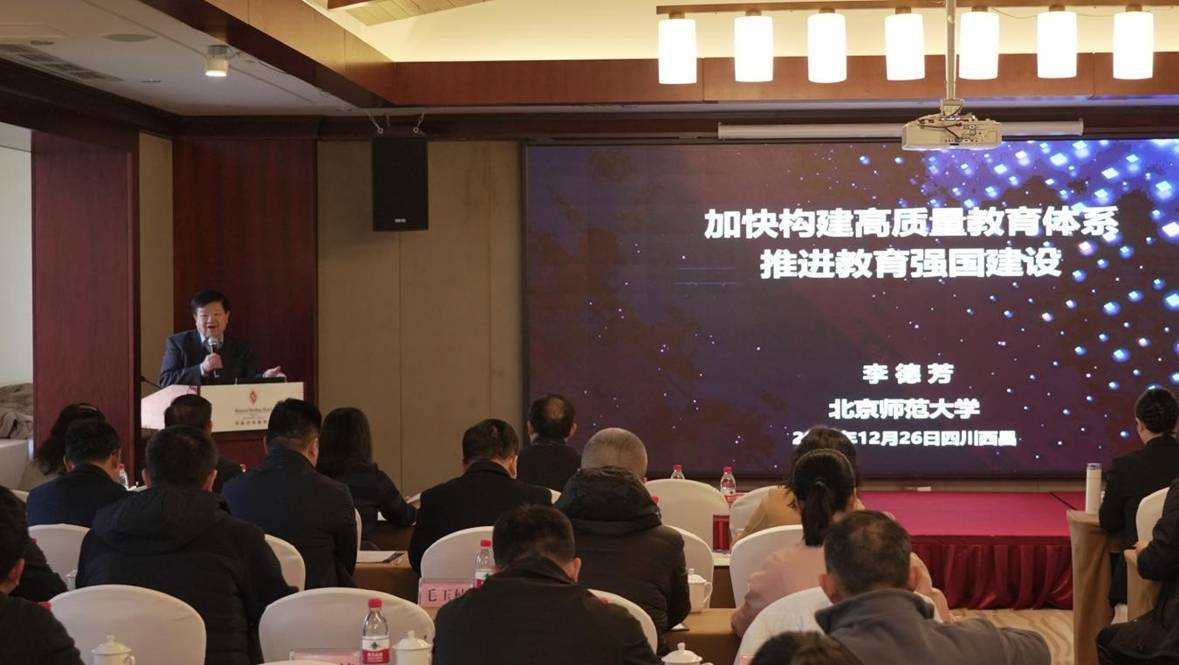 2024年12月25日-12月28日,由全国高师院校继续教育信息化合作联盟主办,四川师范大学继续教育学院、西昌民族幼儿师范高等专科学校和新继教网(北京)教育咨询有限公司共同承办的全国高师院校继续教育信息化合作联盟2024年年会在四川省凉山彝族自治州西昌市盛大召开。教育部职业教育与成人教育司高等继续教育处副处长徐璐,北京师范大学教授、全国高校现代远程教育协作组常务秘书长李德芳,四川师范大学党委常委、副校长郭朝辉,广西师范大学党委常委、副校长黄文韬,中共凉山州委教育工委委员、凉山州教育体育局党组成员、副局长许俊洪,西昌民族幼儿师范高等专科学校党委委员、纪委书记沙德康以及来自哈尔滨师范大学、广西师范大学、河南师范大学、云南师范大学、安徽师范大学、内蒙古师范大学、河北师范大学、江西师范大学等多所高校和联盟秘书长单位新继教网等近百位代表齐聚一堂,共襄盛会。会议由四川师范大学继续教育学院党总支书记张智和内蒙古师范大学继续教育学院院长牛佳主持。