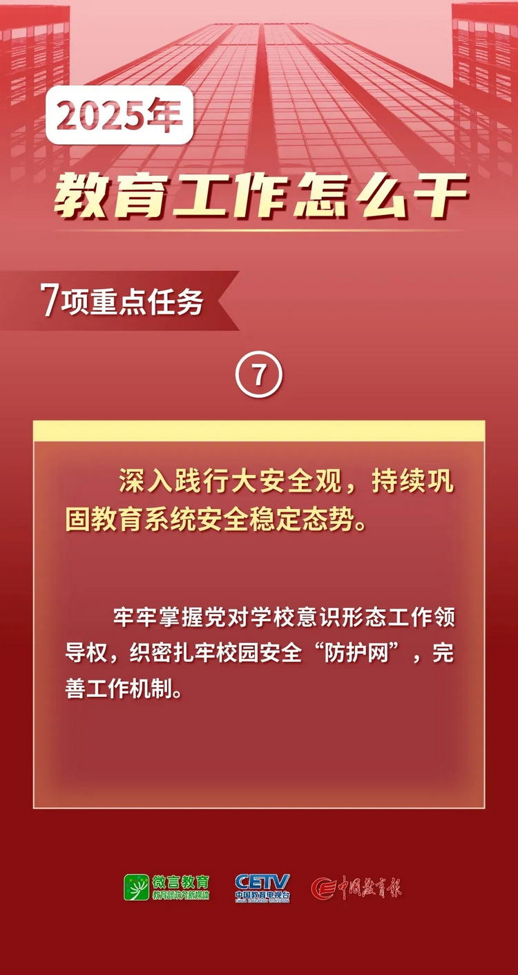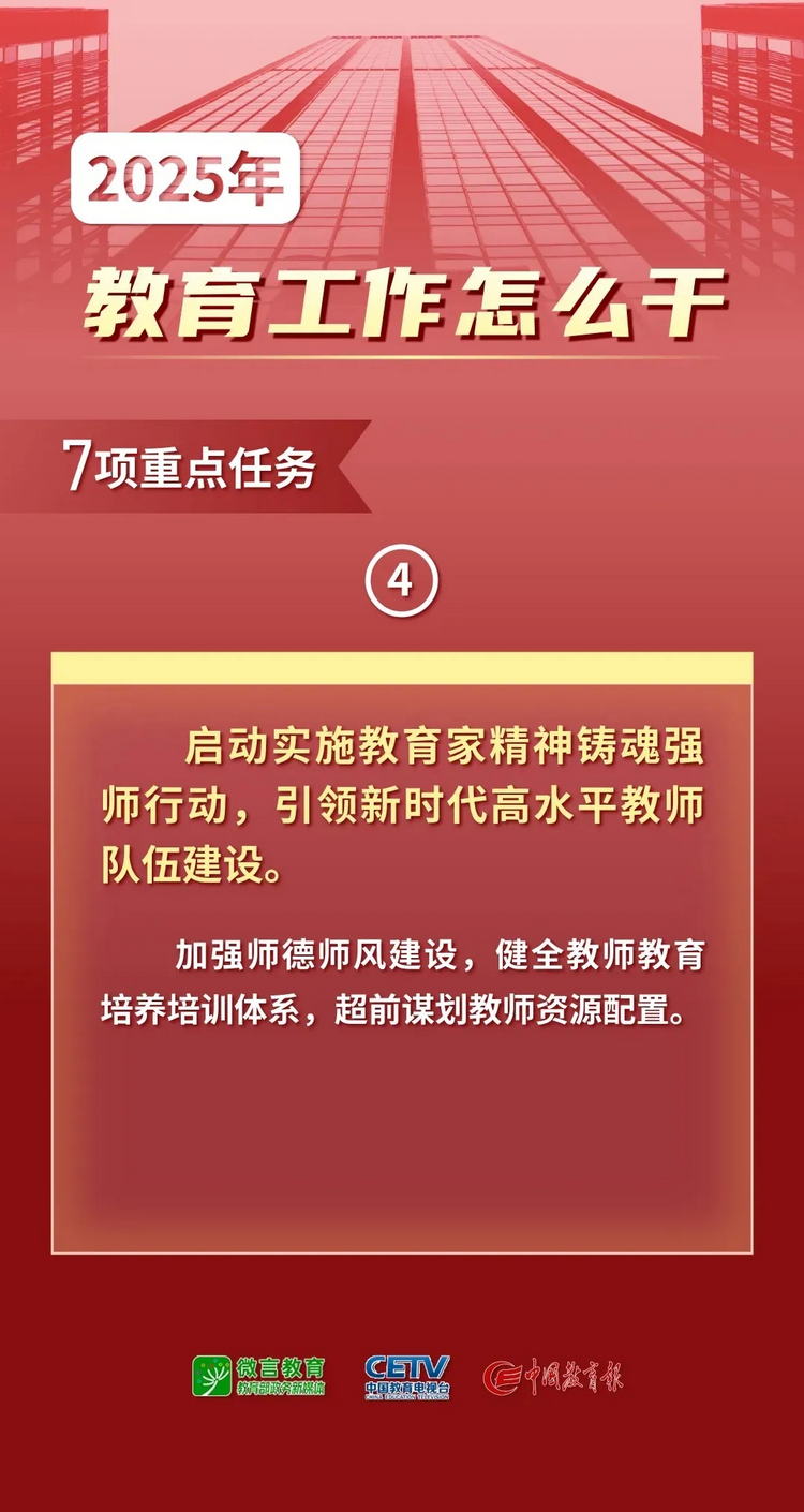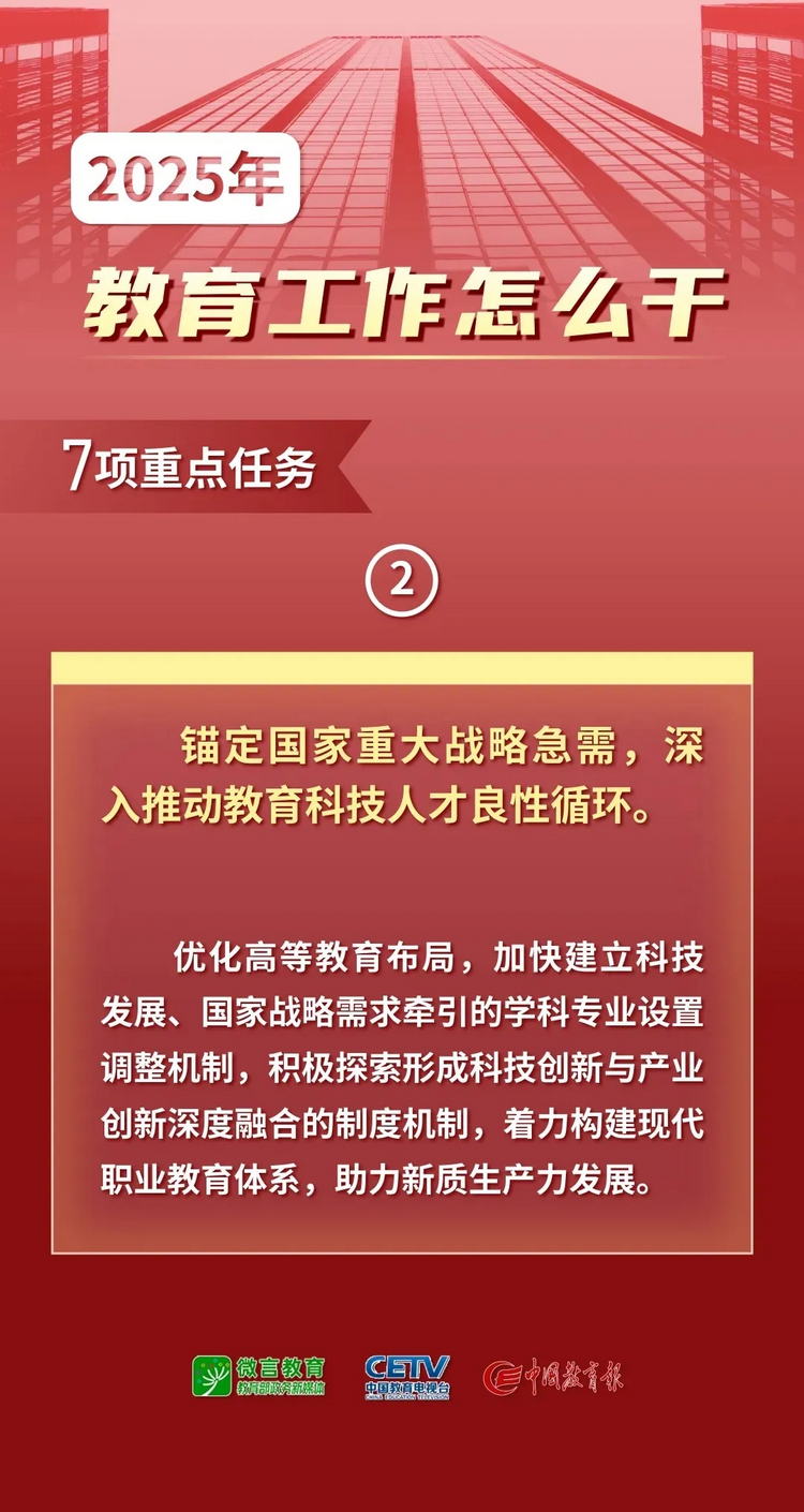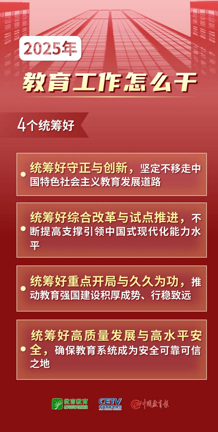 1月9日—10日,2025年全国教育工作会议在北京举行。会议以习近平新时代中国特色社会主义思想为指导,全面贯彻落实党的二十大和二十届二中、三中全会精神,深入学习贯彻全国教育大会精神和习近平总书记关于教育的重要论述,总结工作、分析形势,统一思想、凝聚共识,围绕组织实施教育强国建设规划纲要,安排布置年度重点任务,确保教育强国建设高起点布局、高质量推进。会上说了啥,组图为你划重点——