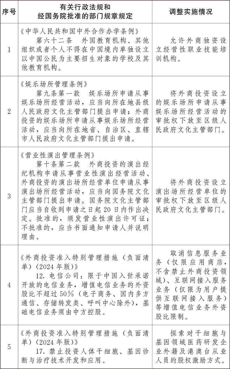 近日,国务院发布《关于同意在北京市暂时调整实施有关行政法规和经国务院批准的部门规章规定的批复》(国函〔2025〕4号)。同意自即日起,在北京市暂时调整实施《中华人民共和国中外合作办学条例》、《娱乐场所管理条例》、《营业性演出管理条例》、《外商投资准入特别管理措施(负面清单)(2024年版)》的有关规定。国务院将根据北京市深化国家服务业扩大开放综合示范区建设情况,适时对本批复的内容进行调整。