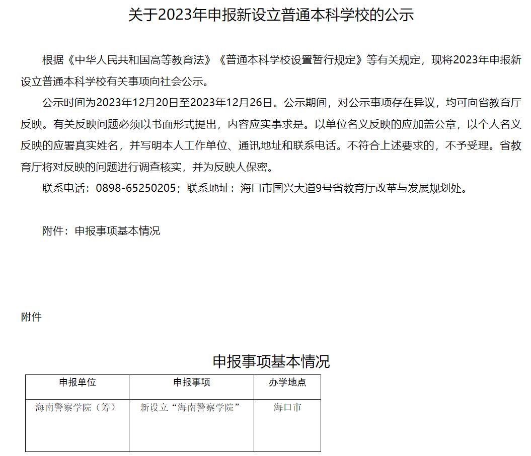 2023年12月20日,海南省教育厅发布《关于2023年申报新设立普通本科学校的公示》,申报新设立“海南警察学院”,办学地点在海口市。