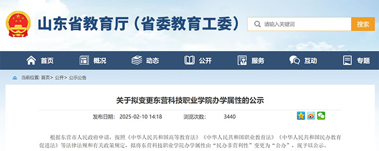 2月10日,山东省教育厅网站发布《关于拟变更东营科技职业学院办学属性的公示》,拟将东营科技职业学院办学属性由“民办非营利性”变更为“公办”。