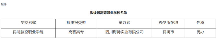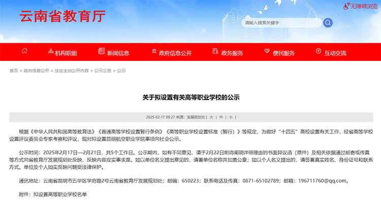 2月17日,云南省教育厅发布公示,拟设置昆明航空职业学院。