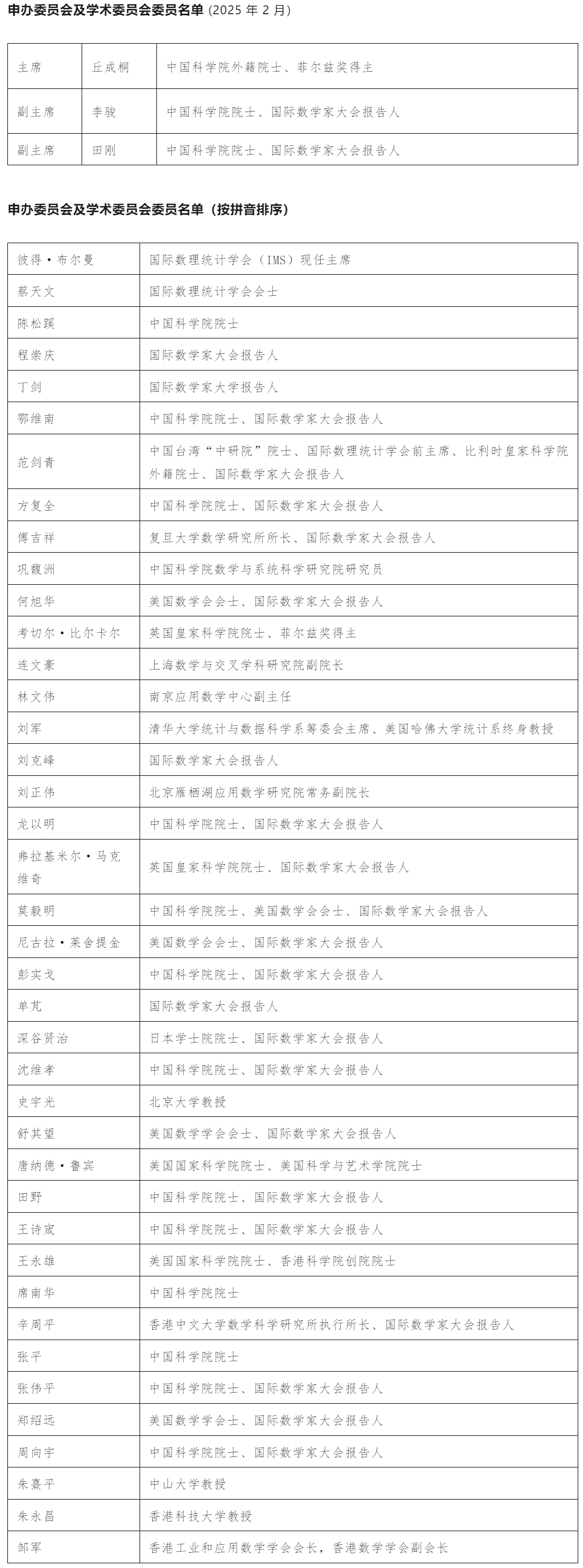 丘成桐教授担任主席并迅速组建了申办及学术委员会,邀请中国数学界众多领军人物,如菲尔兹奖得主、清华大学教授考切尔·比尔卡尔(Caucher Birkar),中国科学院院士田刚、彭实戈、王诗宬、张伟平、席南华、鄂维南、周向宇、方复全、莫毅明、陈松蹊、沈维孝、李骏、张平、田野,国家数学天元基金会领导小组成员程崇庆,北京大学教授史宇光, 清华大学统计与数据科学系筹委会主席刘军,香港大学教授何旭华,香港中文大学教授邹军,以及国际学者日本学士院院士深谷贤治(Kenji Fukaya),英国皇家科学院院士弗拉基米尔·马克维奇(Vladimir Markovic),美国国家科学院院士、美国科学与艺术学院院士唐纳德·鲁宾(Donald B. Rubin)、国际数理统计学会主席彼得·布尔曼(Peter Bühlmann),共计 40 余人,携手并肩,向这一被誉为国际数学界“奥林匹克”的科学盛会发出隆重的邀请。