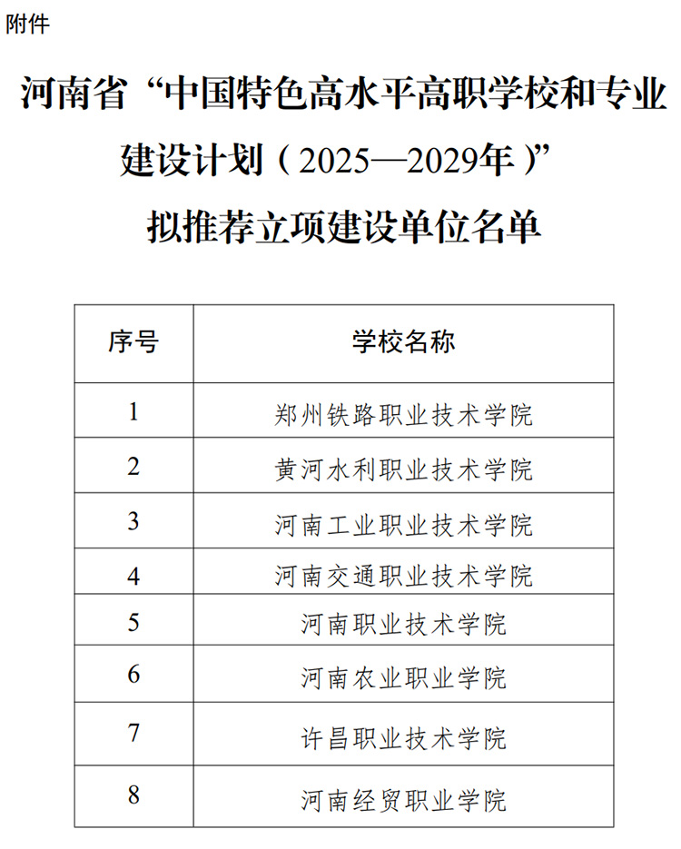 2月20日,河南省教育厅发布《关于“中国特色高水平高职学校和专业建设计划(2025—2029年)”拟推荐立项建设单位的公示》。