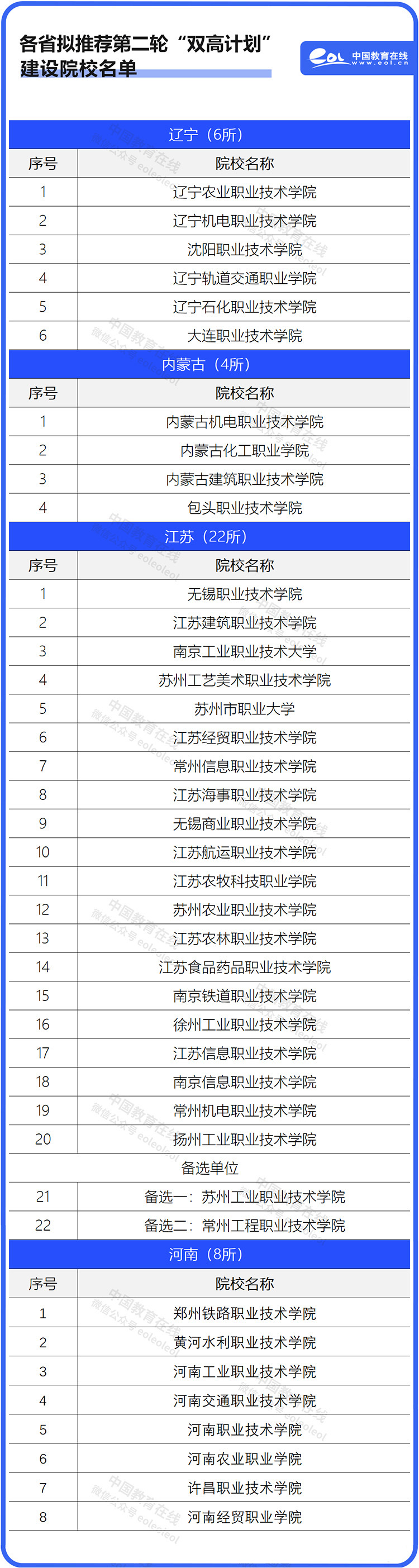 除河南外,近期,江苏、辽宁、内蒙古等地也公示了第二轮国家“双高计划”推荐名单。截至目前,已有40所院校(含备选)拟获推荐进入新一轮“双高计划”建设名单。