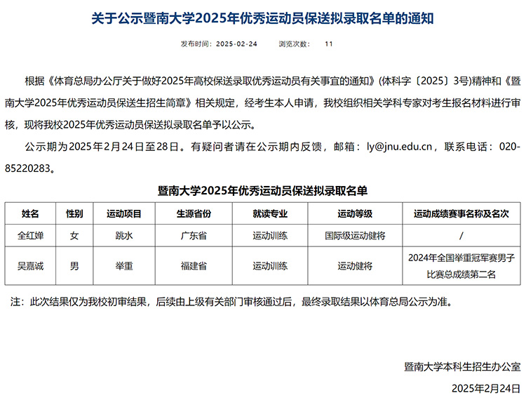 通知提到,根据《体育总局办公厅关于做好2025年高校保送录取优秀运动员有关事宜的通知》(体科字〔2025〕3号)精神和《暨南大学2025年优秀运动员保送生招生简章》相关规定,经考生本人申请,该校组织相关学科专家对考生报名材料进行审核,现将该校2025年优秀运动员保送拟录取名单予以公示。