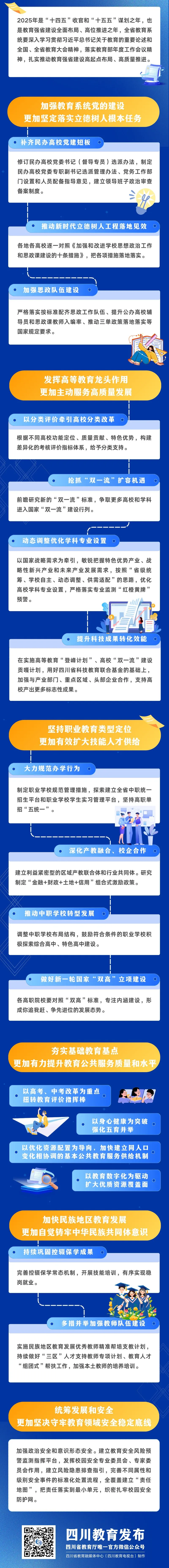 会议强调,2025年是“十四五”收官和“十五五”谋划之年,要在攻坚破难中紧抓关键,准确把握教育强省建设的实践路径。要加强教育系统党的建设,补齐民办高校党建短板,实施新时代立德树人工程,加强思政队伍建设,更加坚定落实立德树人根本任务。要发挥高等教育龙头作用,以分类评价牵引高校分类改革,抢抓“双一流”扩容机遇,动态调整优化学科专业设置,提升科技成果转化效能,更加主动服务高质量发展。要坚持职业教育类型定位,大力规范办学行为,深化产教融合、校企合作,推动中职学校转型发展,做好新一轮国家“双高”立项建设,更加有效扩大技能人才供给。要夯实基础教育基点,以高考、中考改革为重点,扭转教育评价指挥棒;以身心健康为突破,强化五育并举;以优化资源配置为导向,加快建立同人口变化相协调的基本公共教育服务供给机制;以教育数字化为驱动,扩大优质资源覆盖面,更加有力提升教育公共服务质量和水平。要加快民族地区教育发展,持续巩固控辍保学成果,多措并举加强教师队伍建设,更加自觉铸牢中华民族共同体意识。要统筹发展和安全,提升安全工作专业性、预见性,把责任落实到最小单元,确保政治安全和意识形态安全,更加坚决守牢教育领域安全稳定底线。