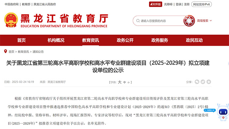 2月24日,黑龙江省教育厅发布《关于黑龙江省第三轮高水平高职学校和高水平专业群建设项目(2025-2029年)拟立项建设单位的公示》。