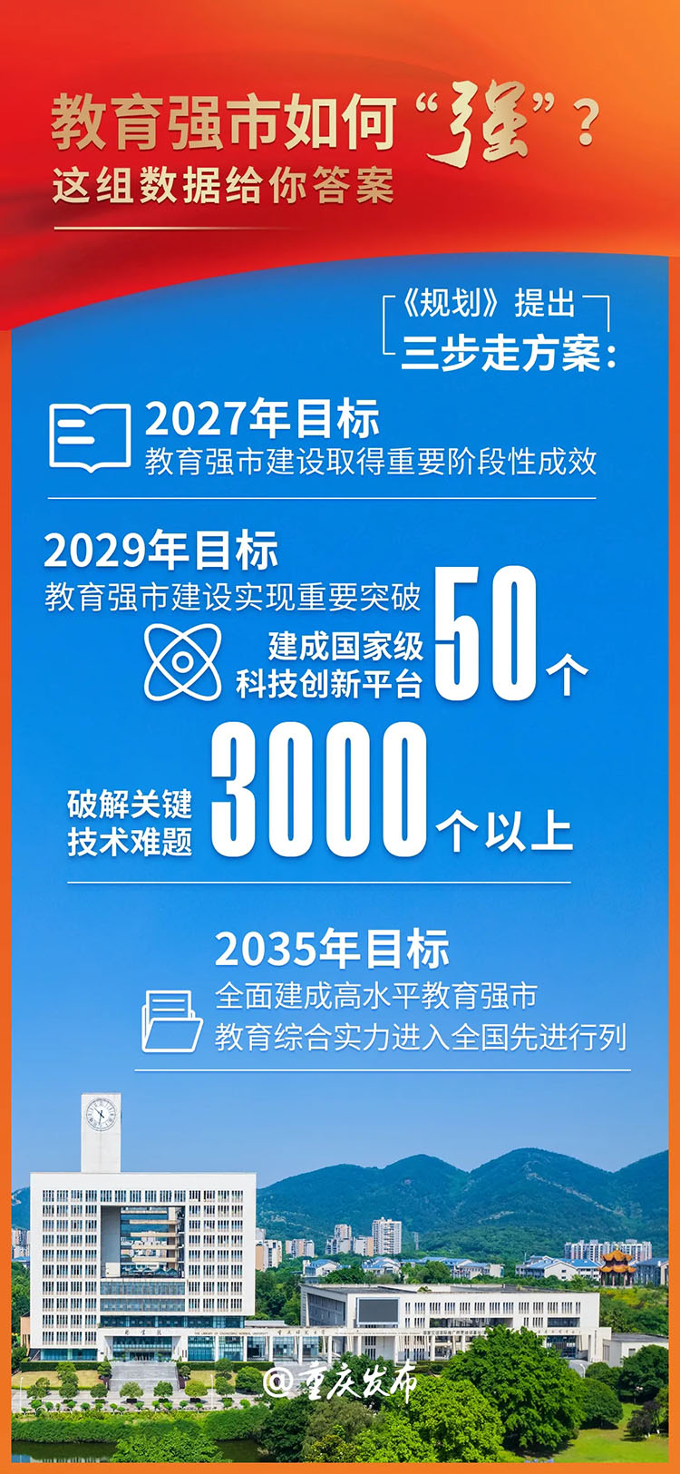2月27日,重庆市政府新闻办举行《重庆加快建设教育强市 推进教育现代化规划(2024—2035年)》新闻发布会。会上,市教委就《规划》介绍了相关情况,明确了《规划》的总体要求、主要任务、组织实施。重庆如何打造教育强市?一组数据给你答案。