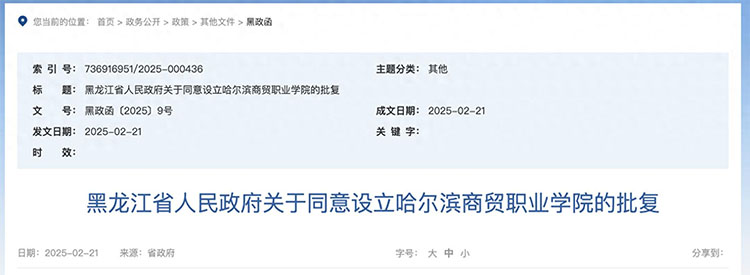 黑龙江省政府批复,同意设立哈尔滨商贸职业学院