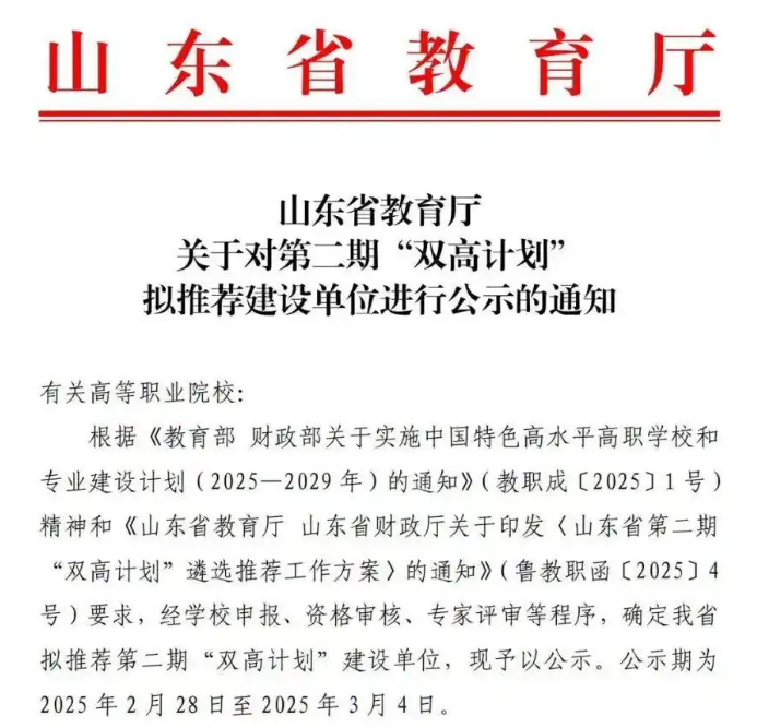 近日,山东省教育厅发布《关于对第二期“双高计划”拟推荐建设单位进行公示的通知》,拟推荐16所院校进行第二期“双高计划”建设,公示期为2025年2月28日至2025年3月4日。