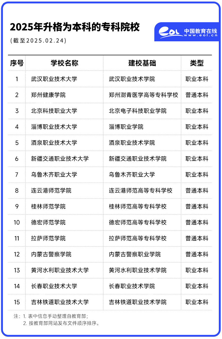 日前,教育部公布了一批高等学校设置审批、备案结果。据统计,本批次教育部共同意15所专科高职院校正式升格为本科层次院校。