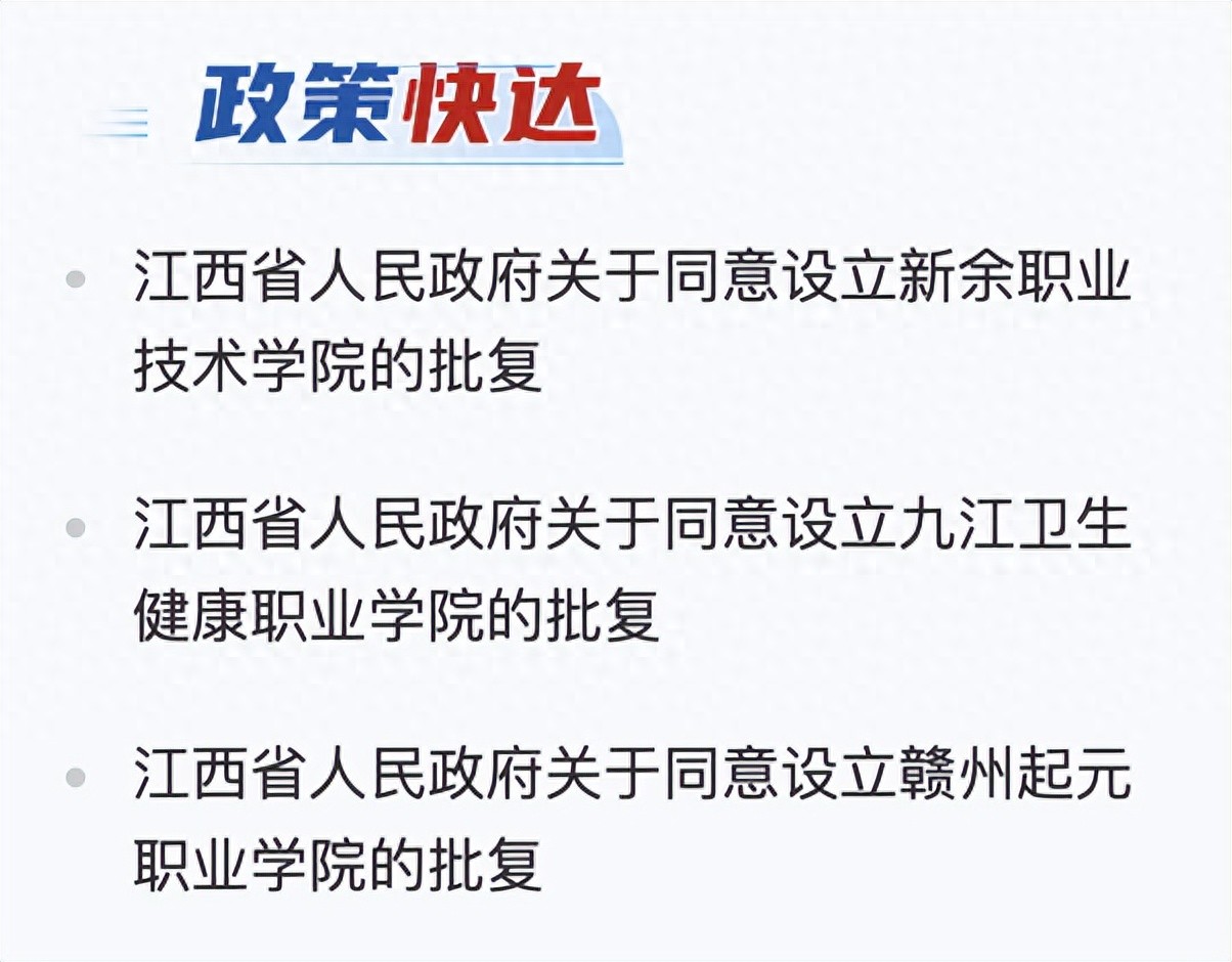 近日,江西省人民政府网站陆续发布《江西省人民政府关于同意设立新余职业技术学院的批复》、《江西省人民政府关于同意设立九江卫生健康职业学院的批复》、《江西省人民政府关于同意设立赣州起元职业学院的批复》。其中,新余职业技术学院、九江卫生健康职业学院为公办专科层次普通高等学校,赣州起元职业学院为非营利性民办专科层次普通高等学校。