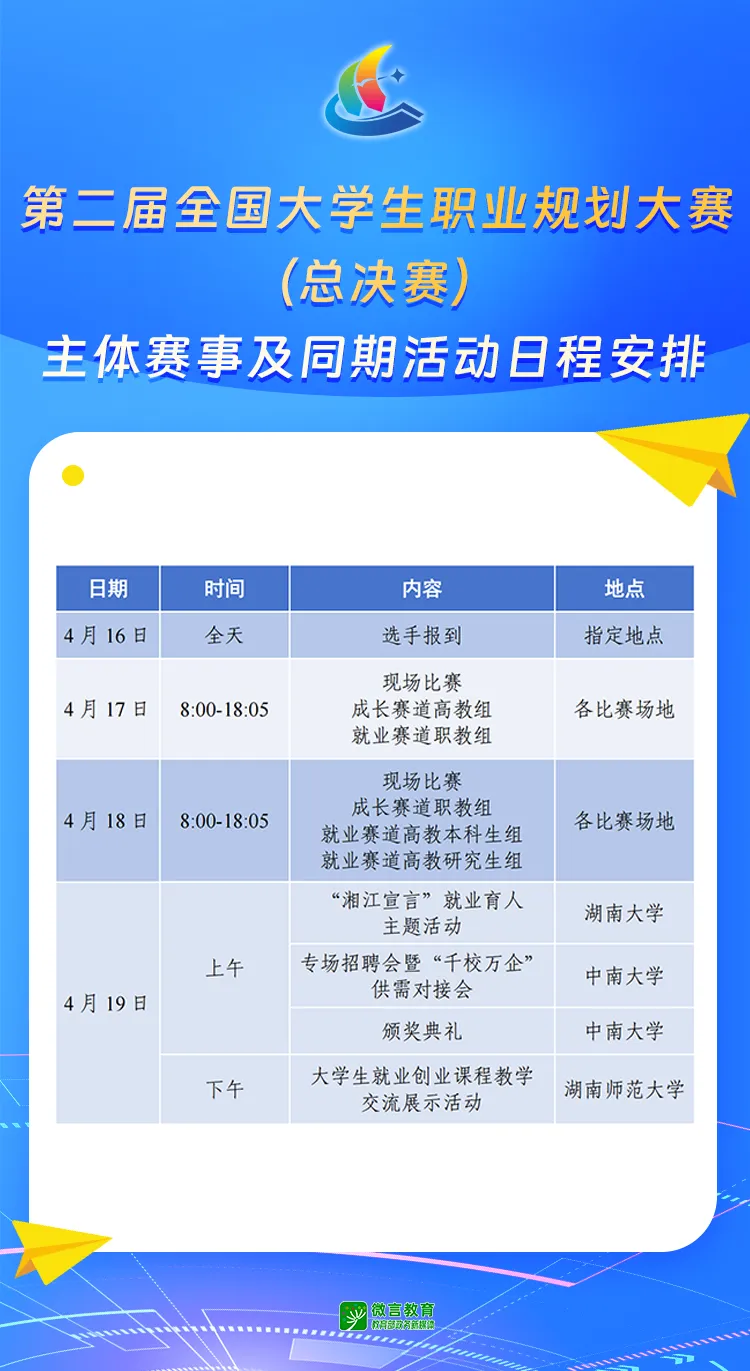 第二届全国大学生职业规划大赛总决赛将于4月16日至19日在湖南省长沙市举办。