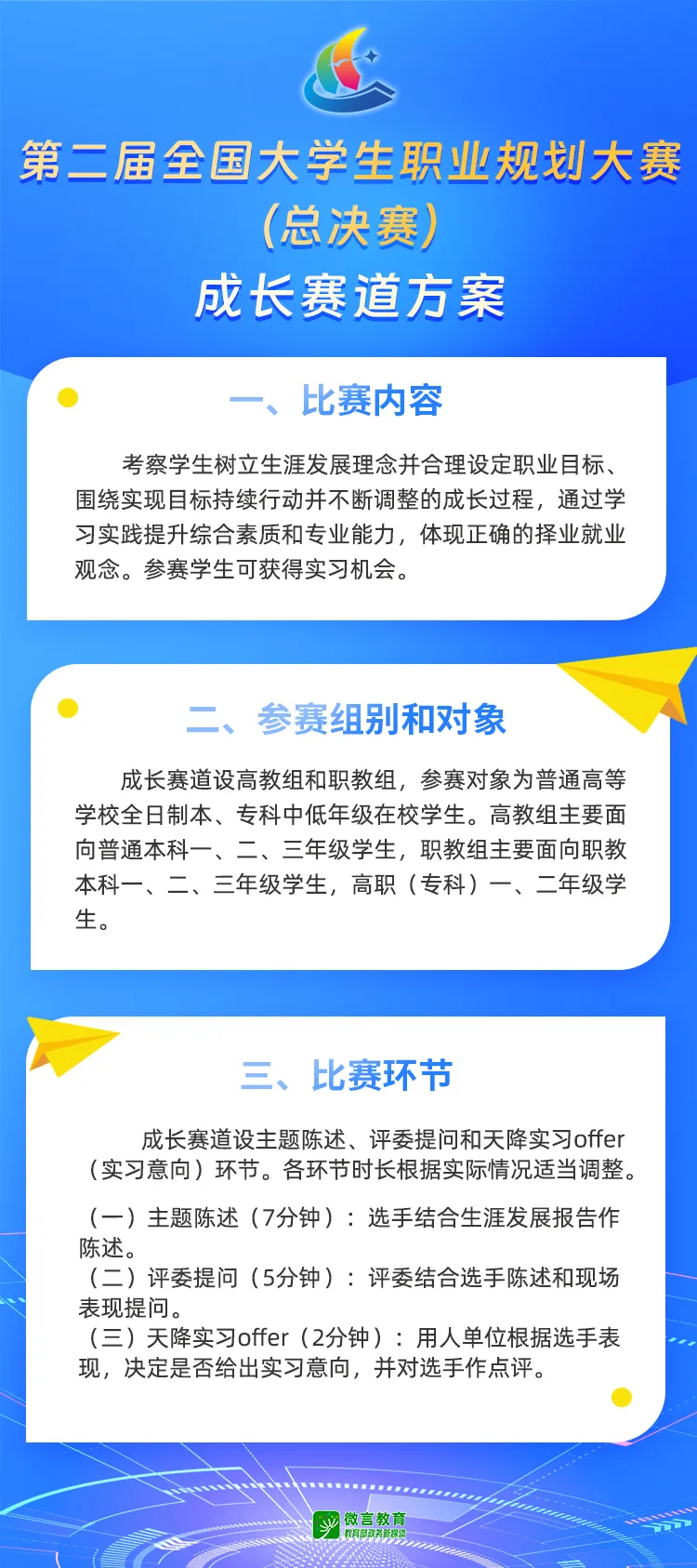 大赛总决赛学生成长赛道高教组、职教组将在湖南大学举行,主要考察学生树立生涯发展理念并合理设定职业目标、围绕实现目标持续行动并不断调整的成长过程,通过学习实践提升综合素质和专业能力,体现正确的择业就业观念,参赛学生可获得实习机会。