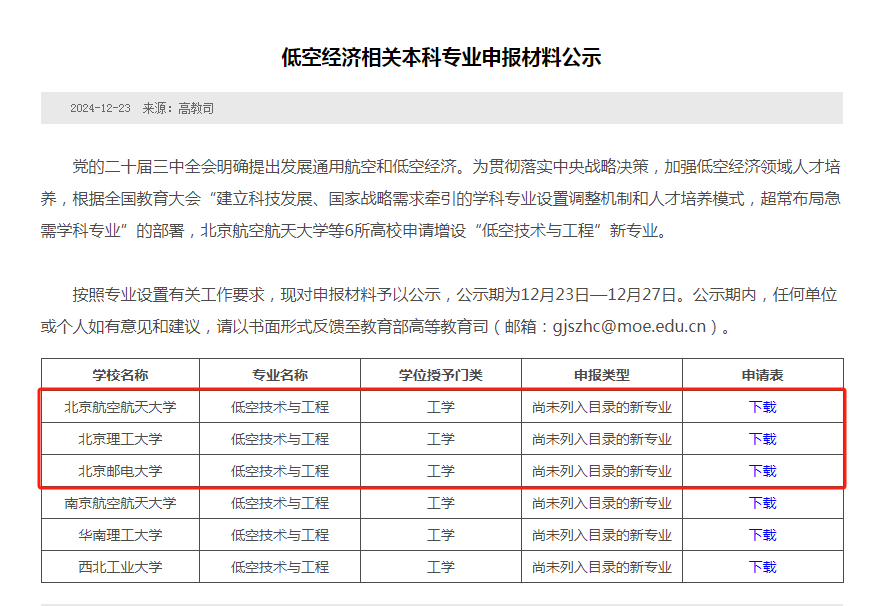 根据全国教育大会“建立科技发展、国家战略需求牵引的学科专业设置调整机制和人才培养模式,超常布局急需学科专业”的部署,去年年底,教育部官方网站公示全国6所高校申请增设“低空技术与工程”新专业,其中包含3所在京高校。