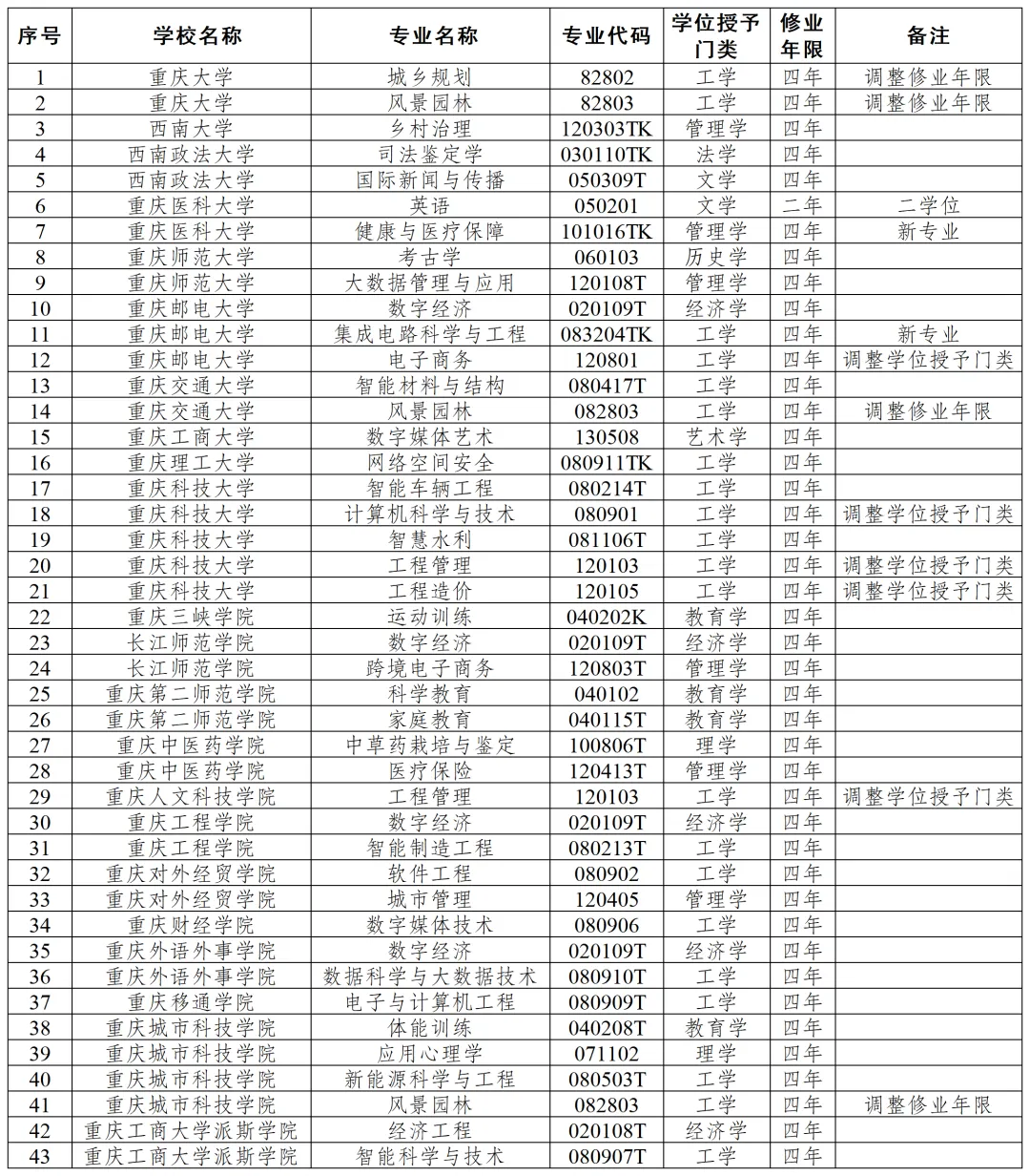 本次专业增设充分体现服务国家战略和区域经济社会发展需求导向,在服务健康中国、西部陆海新通道建设等国家战略方面,增设了健康与医疗保障、跨境电子商务、国际新闻与传播等专业。在集成电路、人工智能、网络安全等急需和新兴领域,增设集成电路科学与工程、智能科学与技术、网络空间安全等专业。在服务支撑重庆“33618”现代制造业、现代服务业、现代农业等重点产业集群发展方面,增设智能车辆工程、智能制造工程、智能材料与结构、数字经济、乡村治理、智慧水利等专业。