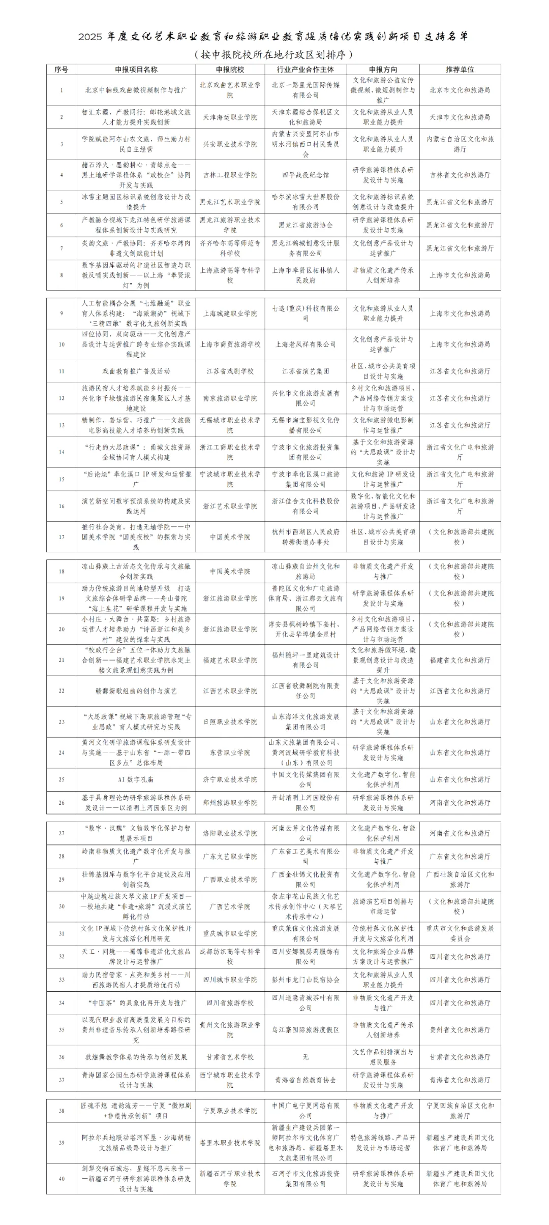 按照《文化和旅游部办公厅关于组织开展2025年度文化艺术职业教育和旅游职业教育提质培优实践创新项目的通知》(办科教函〔2025〕55号)要求,经申报、专家评审和公示,我部确定了2025年度文化艺术职业教育和旅游职业教育提质培优实践创新项目支持名单,现予公布。请切实加强对相关单位及项目实施工作的跟踪指导,推动项目落地见效。