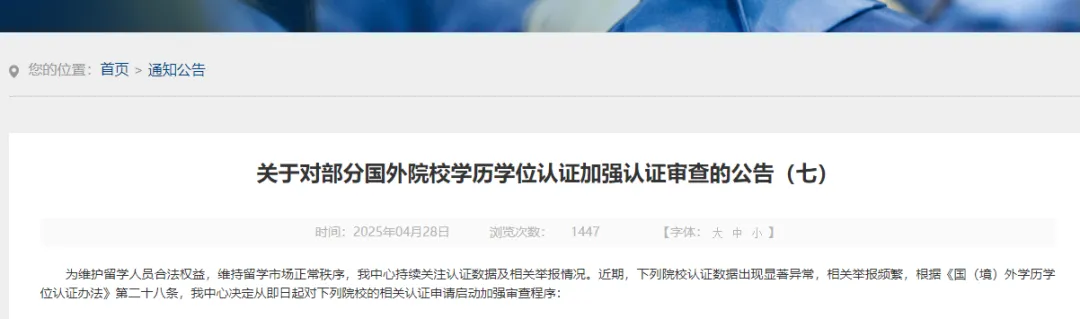 4月28日,教育部留学服务中心发布《关于对部分国外院校学历学位认证加强认证审查的公告(七)》。对多所认证数据出现显著异常的国外院校(项目)的相关认证申请启动加强审查程序。