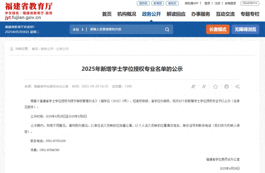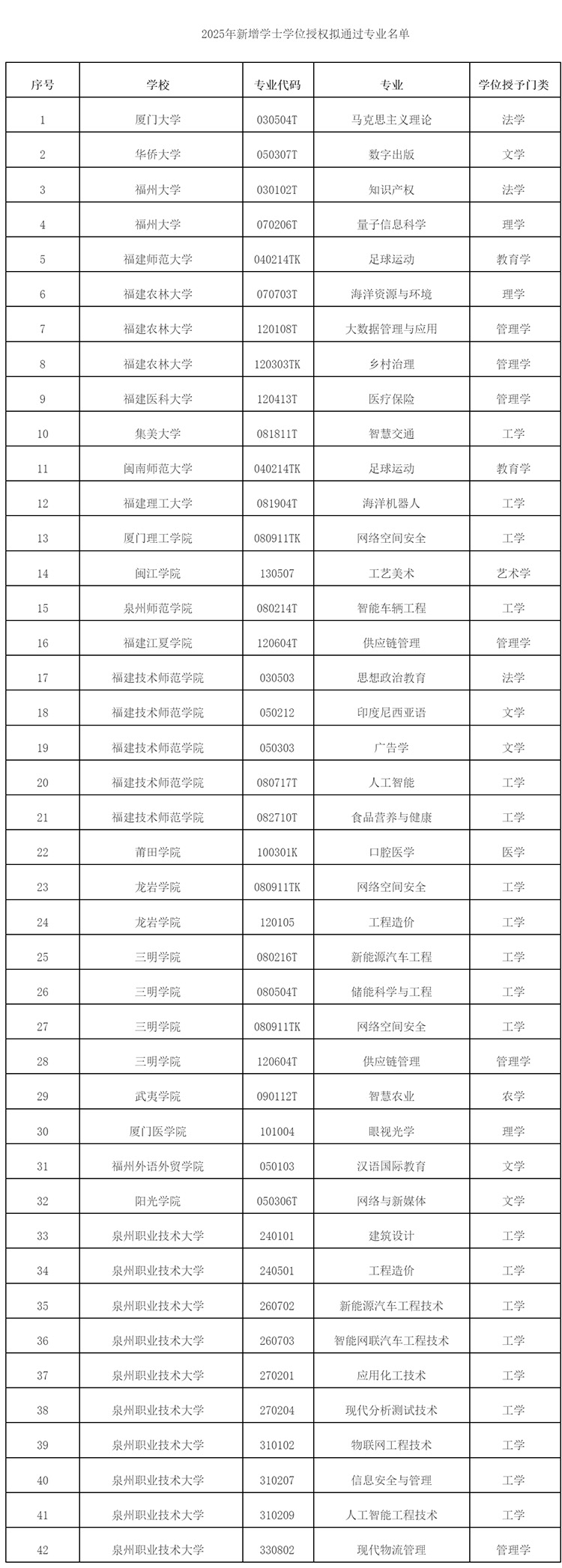 近日,福建省教育厅官网发布《2025年新增学士学位授权专业名单的公示》,根据《福建省学士学位授权与授予审核管理办法》(闽学位〔2022〕3号),经高校申报、省学位办审核,对42个拟新增学士学位授权专业予以公示。