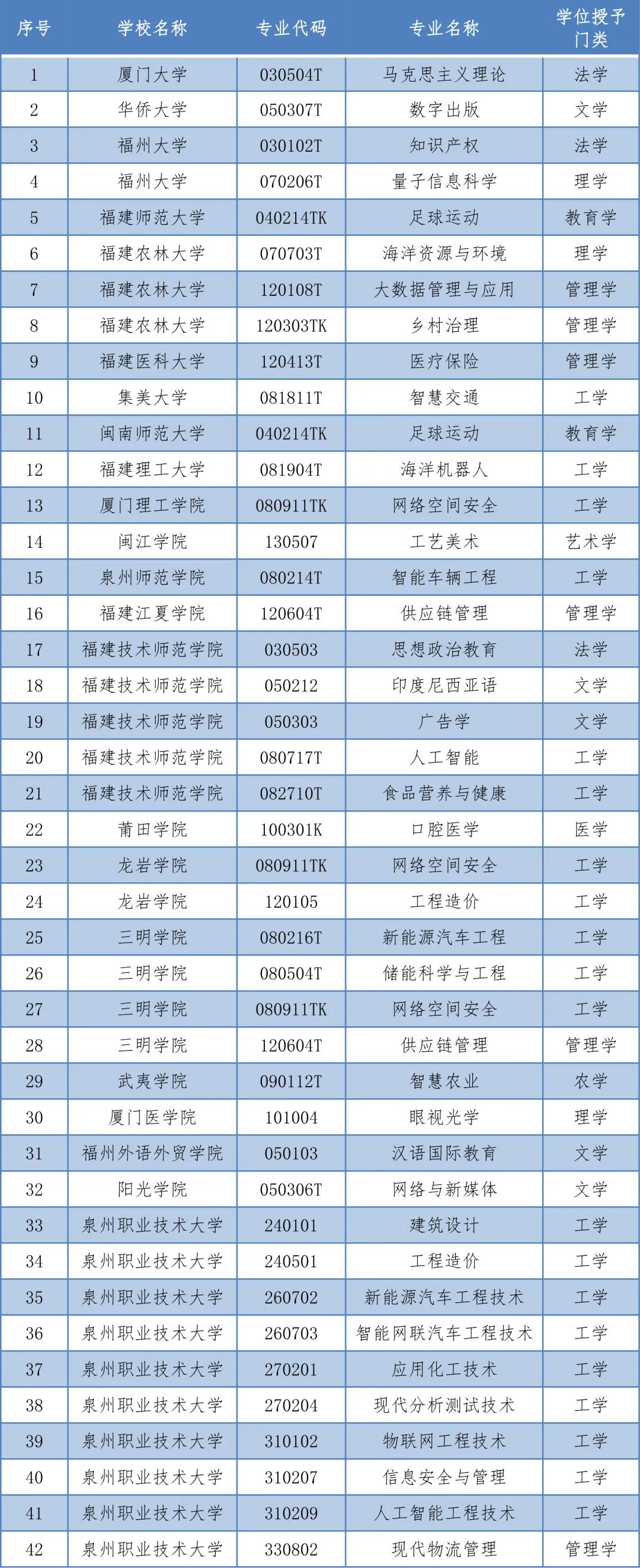 日前,福建省学位委员会印发《关于公布2025年新增学士学位授权专业名单的通知 》,同意厦门大学等22所院校申请的马克思主义理论等42个本科专业增列为学士学位授权专业,并公布名单。