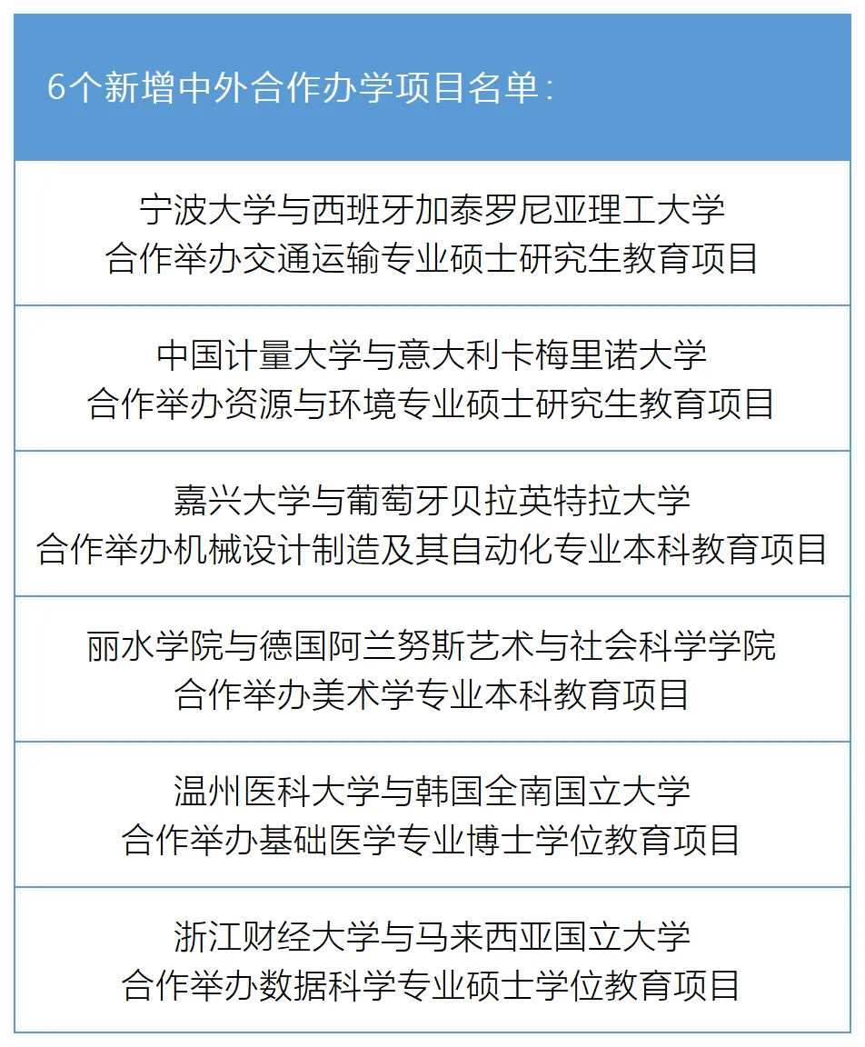 近日,教育部公布了新一批获准的本科及以上层次中外合作办学机构和项目名单。浙江省共新增北京航空航天大学中法未来科技学院、浙江科技大学塞吉巴黎未来城市工程学院、浙江水利水电学院尼尔森马尔伯勒智能工程学院等3个中外合作机构和宁波大学与西班牙加泰罗尼亚理工大学合作举办交通运输专业硕士研究生教育项目等6个中外合作办学项目。据了解,浙江省中外合作办学机构已达29所,数量居全国第2位。中外合作办学项目161个。