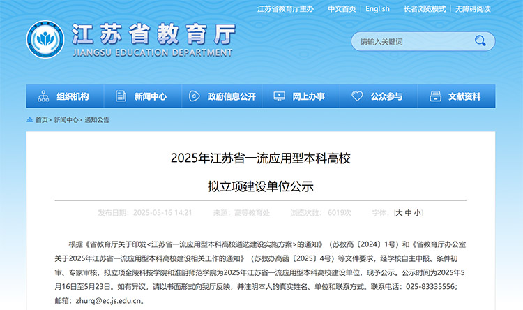 5月16日,江苏省教育厅发布《2025年江苏省一流应用型本科高校拟立项建设单位公示》。根据相关文件要求,经学校自主申报、条件初审、专家审核,拟立项金陵科技学院和淮阴师范学院为2025年江苏省一流应用型本科高校建设单位。