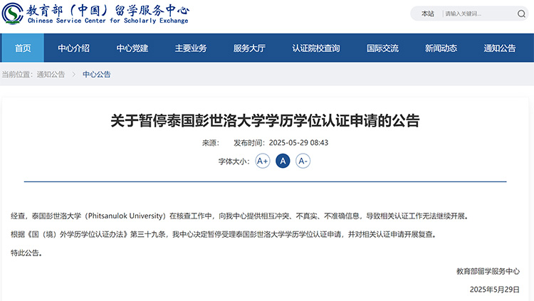 5月29日,教育部留学服务中心发布《关于暂停泰国彭世洛大学学历学位认证申请的公告》。