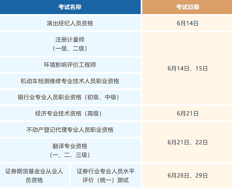 6月专业技术人员职业资格考试时间表