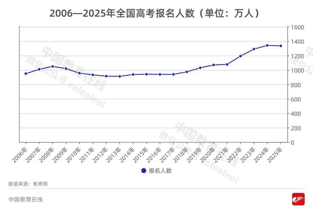 6月7日上午,一年一度的全国高考正式开考。教育部公布的数据显示,2025年全国高考报名人数1335万人,比2024年减少7万人,这是8年来全国高考报名人数首次下降。